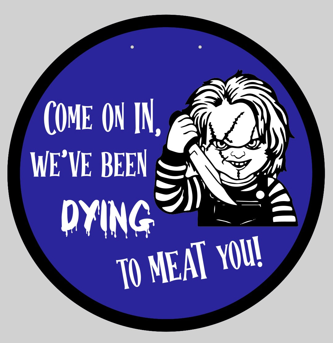 Chucky is “dying” to “meat” all your guests. Order as a DIY kit, paint in studio, or order a finished sign. Be sure to specify your greeting or name on this sign prior to checkout. 2 size options available: 18" or 14"