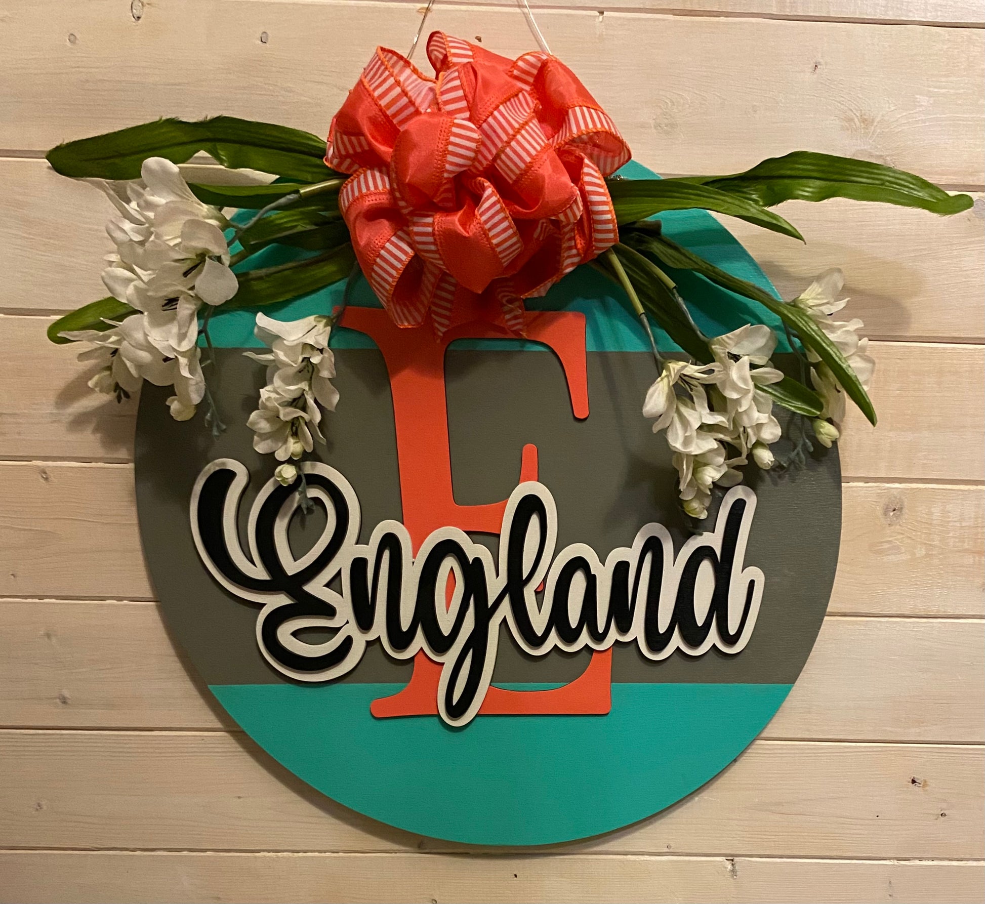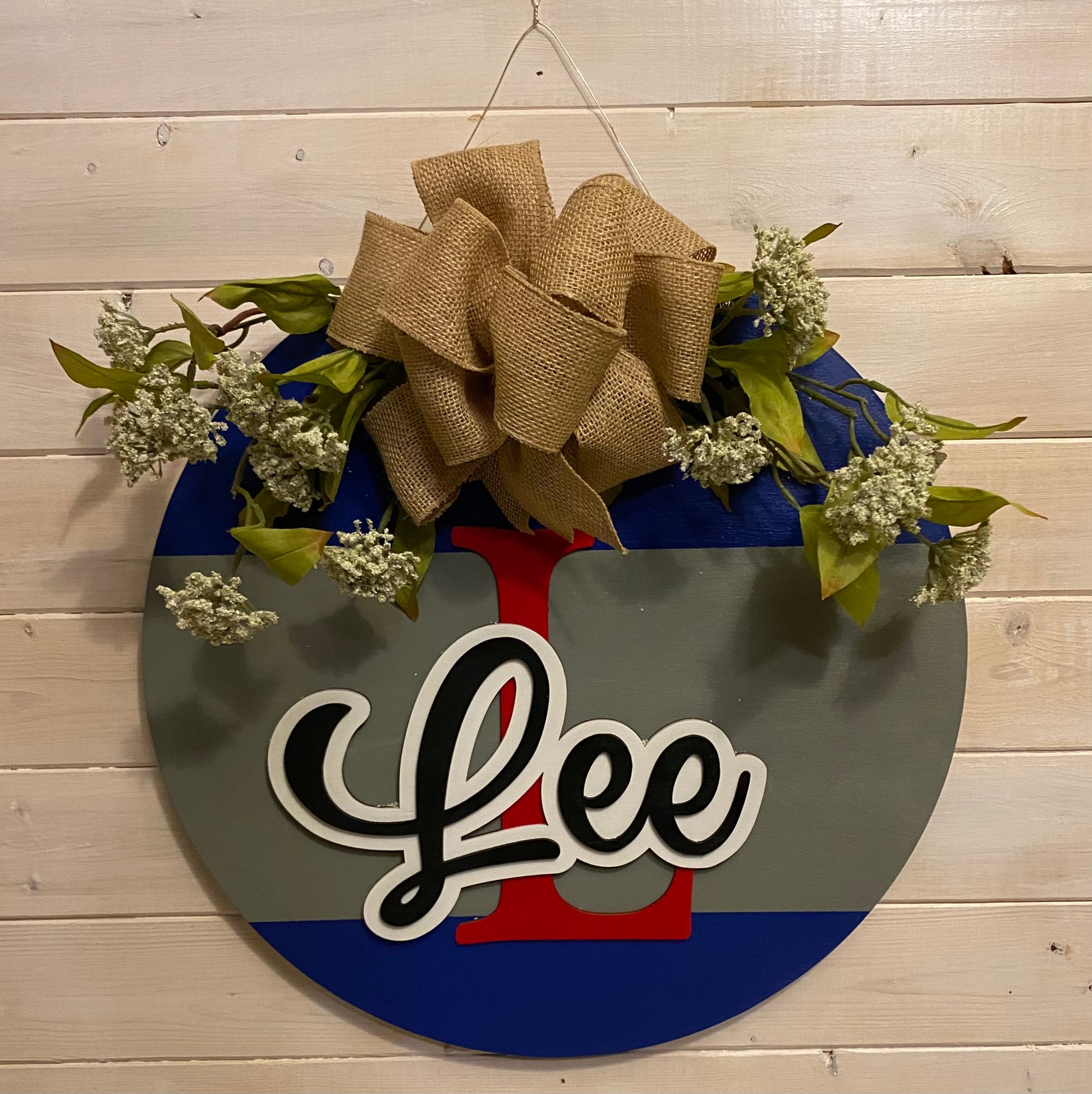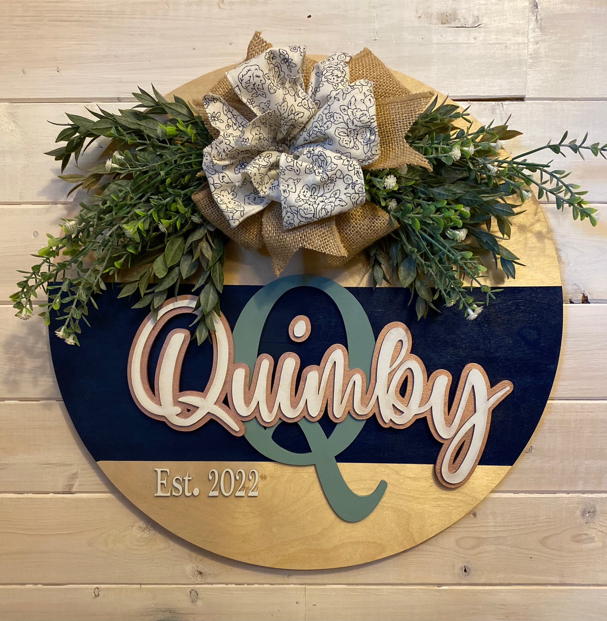 This layered welcome sign comes personalized with your initial and last name or initial with welcome! Order as a DIY kit, paint in studio, or order a finished sign. Your sign DOES NOT include greenery, flowers, or bow. You may request florals and greens at an additional charge.