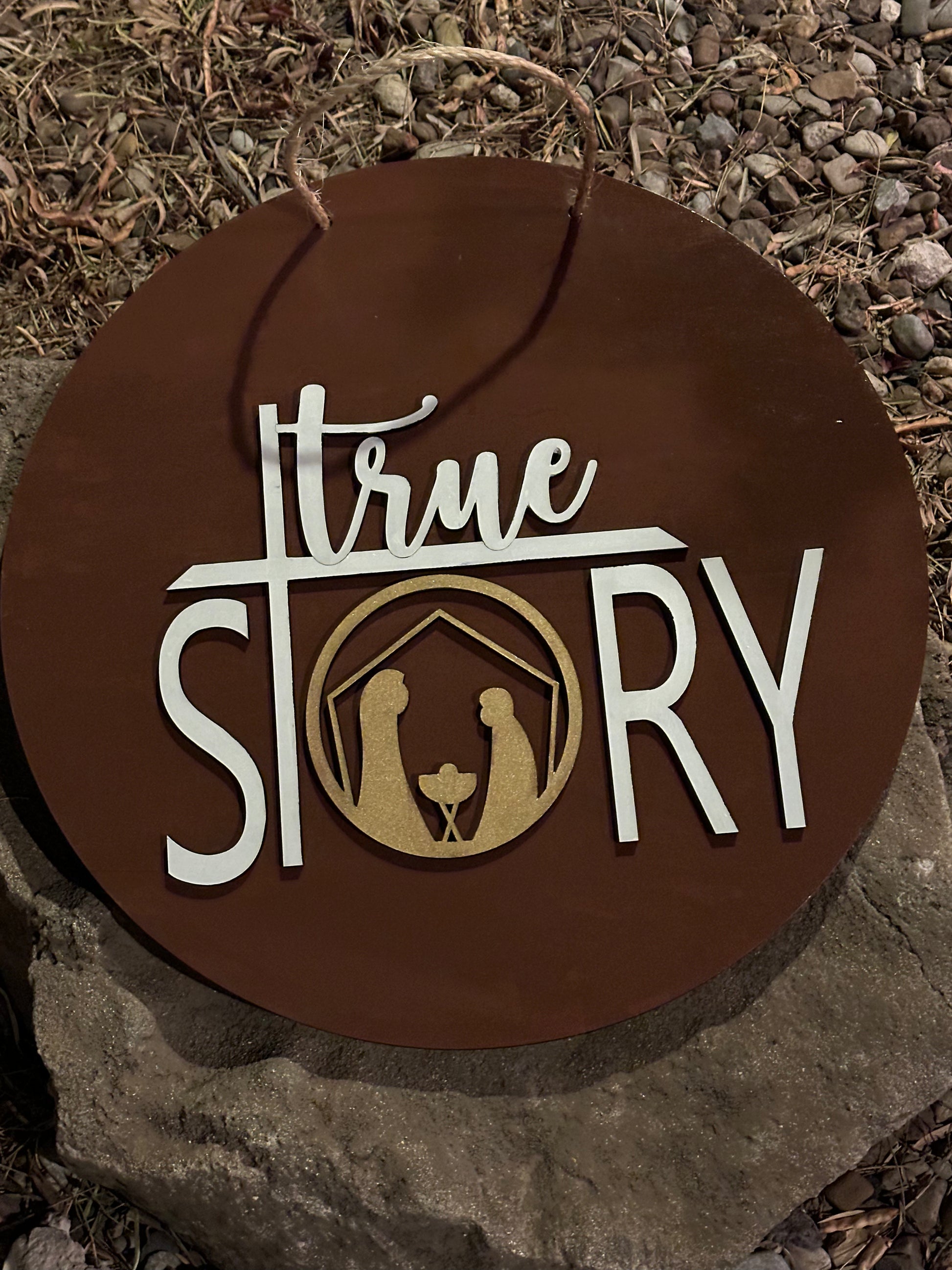 Display the reason for the season with this beautiful True Story sign. You can order as a DIY kit, paint in studio, or order a finished sign. Your sign DOES NOT include greenery, flowers, or bow. You may request florals and greens at an additional charge.