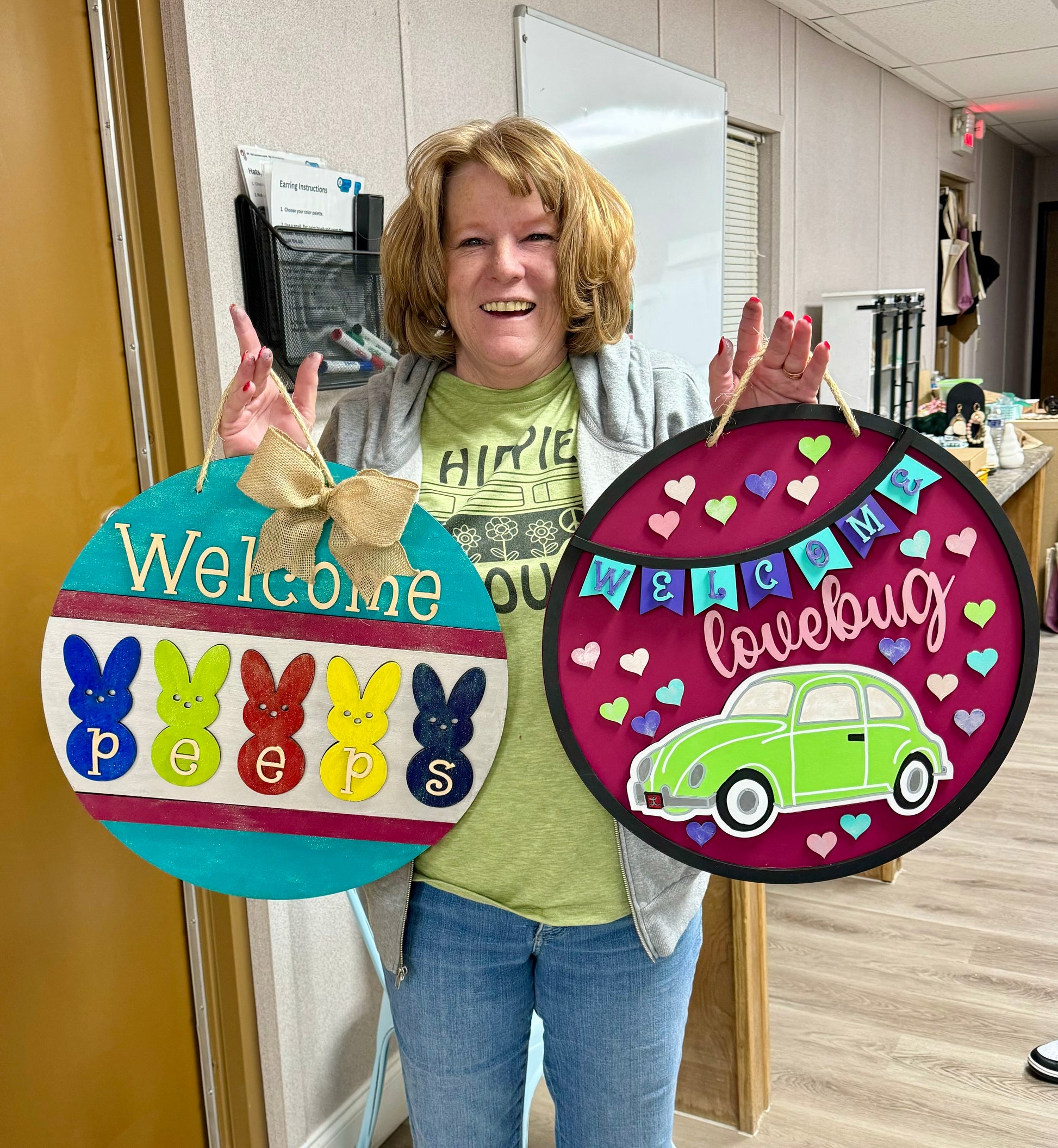 This layered Easter peeps sign is so charming and cute! Order as a DIY kit, paint in studio, or order a finished sign. 2 size options available: 18" or 14"
